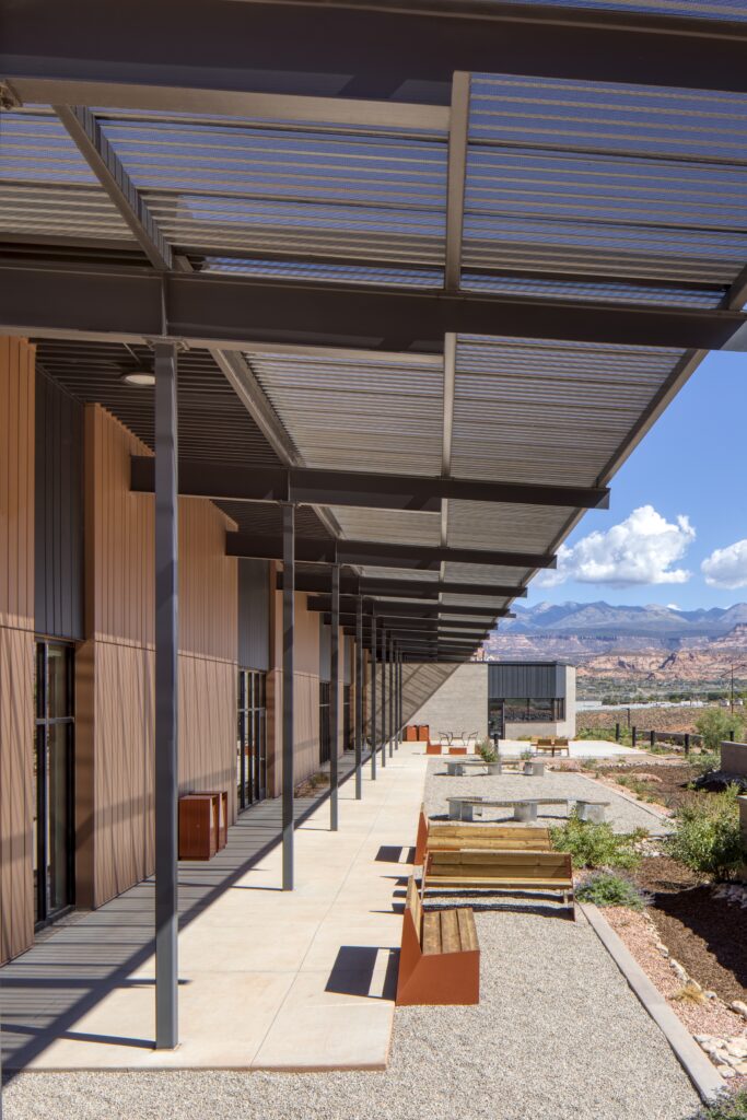 Situated at the base of the Moab Rim, the new Utah State University Moab Academic Building aspires to set a new standard of sustainable development on the Colorado Plateau by implementing passive design strategies, low-energy consumption, and high-performance systems. Designed to embrace the desert landscape and touch lightly upon the land, this educational facility is home to classrooms, labs, career and technical education (CTE) shops, administration/ faculty offices, student collaboration spaces, 4-H programs for children and adults, and local community functions. A large floating roof creates a series of outdoor rooms that celebrate place and a sense of campus within one building.